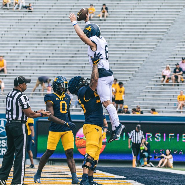 For the blue team, Bryce Ford-Wheaton led receivers with six catches for 98 yards and a touchdown, while Morgantown native Preston Fox led receivers on the gold team with five catches for 117 yards.